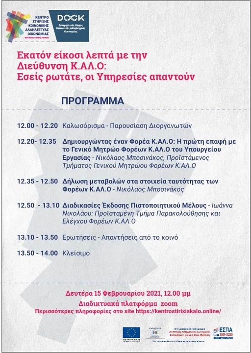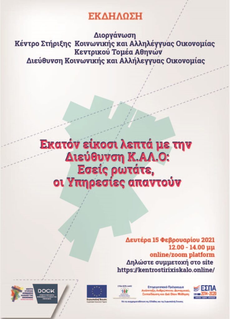 Το Κέντρο Στήριξης φορέων Κ.ΑΛ.Ο Κεντρικού Τομέα Αθηνών & η Διεύθυνση Κοινωνικής και Αλληλέγγυας Οικονομίας διοργανώνουν διαδικτυακή εκδήλωση την  Δευτέρα 15 Φεβρουαρίου και ώρα 12:00 – 14:00
