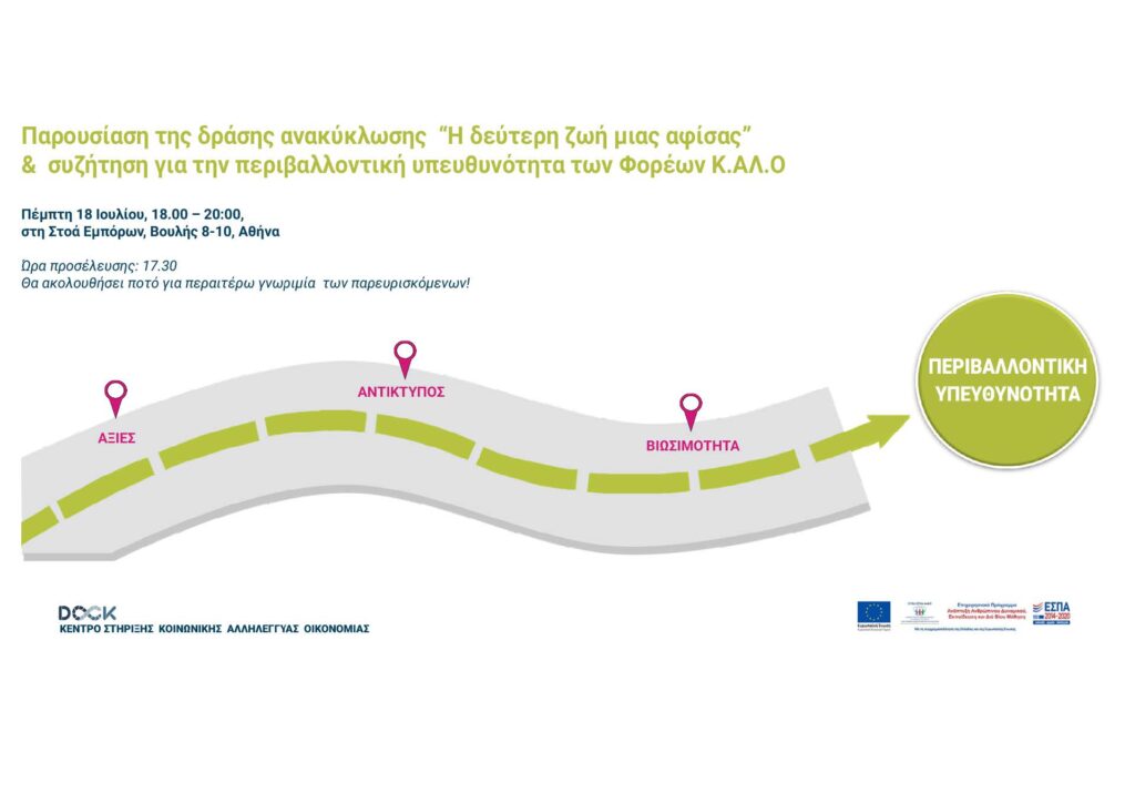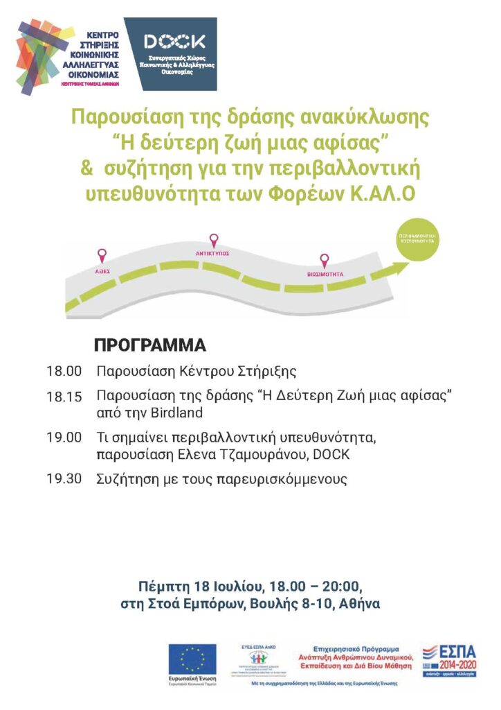 Το Κέντρο στήριξης Κοινωνικής Αλληλέγγυας Οικονομίας, Dock  διοργανώνει την εκδήλωση, Η “2η ζωή μιας αφίσας”: Κ.Αλ.Ο & Περιβάλλον, την Πέμπτη 18 Ιουλίου, ώρα 18.00-20.00 στην Στοά Εμπόρων, Βουλής 4, Αθήνα
