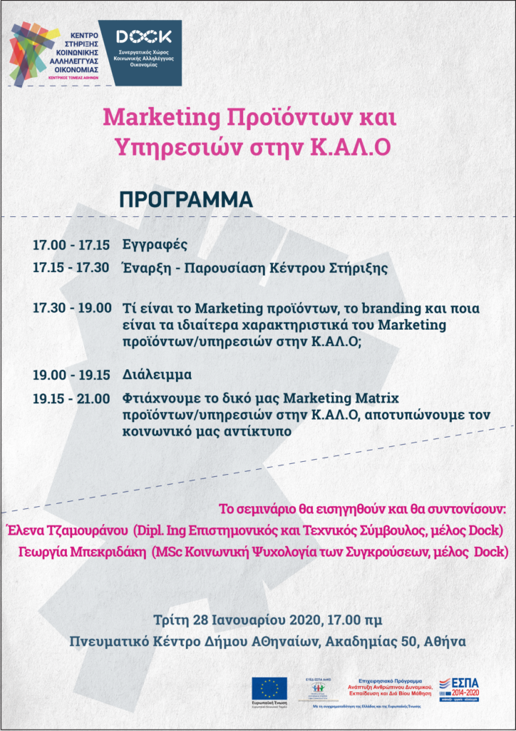 Το σεμινάριο – εργαστήρι στοχεύει στο να μπορούμε να αναγνωρίζουμε τα διαφορετικά χαρακτηριστικά ενός προϊόντος & μιας υπηρεσίας, να μπορούμε να ενσωματώσουμε την προσέγγιση της Κ.ΑΛ.Ο και να χρησιμοποιούμε το marketing matrix ως αξιολόγηση του αντίκτυπου της δράσης μας σε κοινωνία, οικονομία, περιβάλλον.
