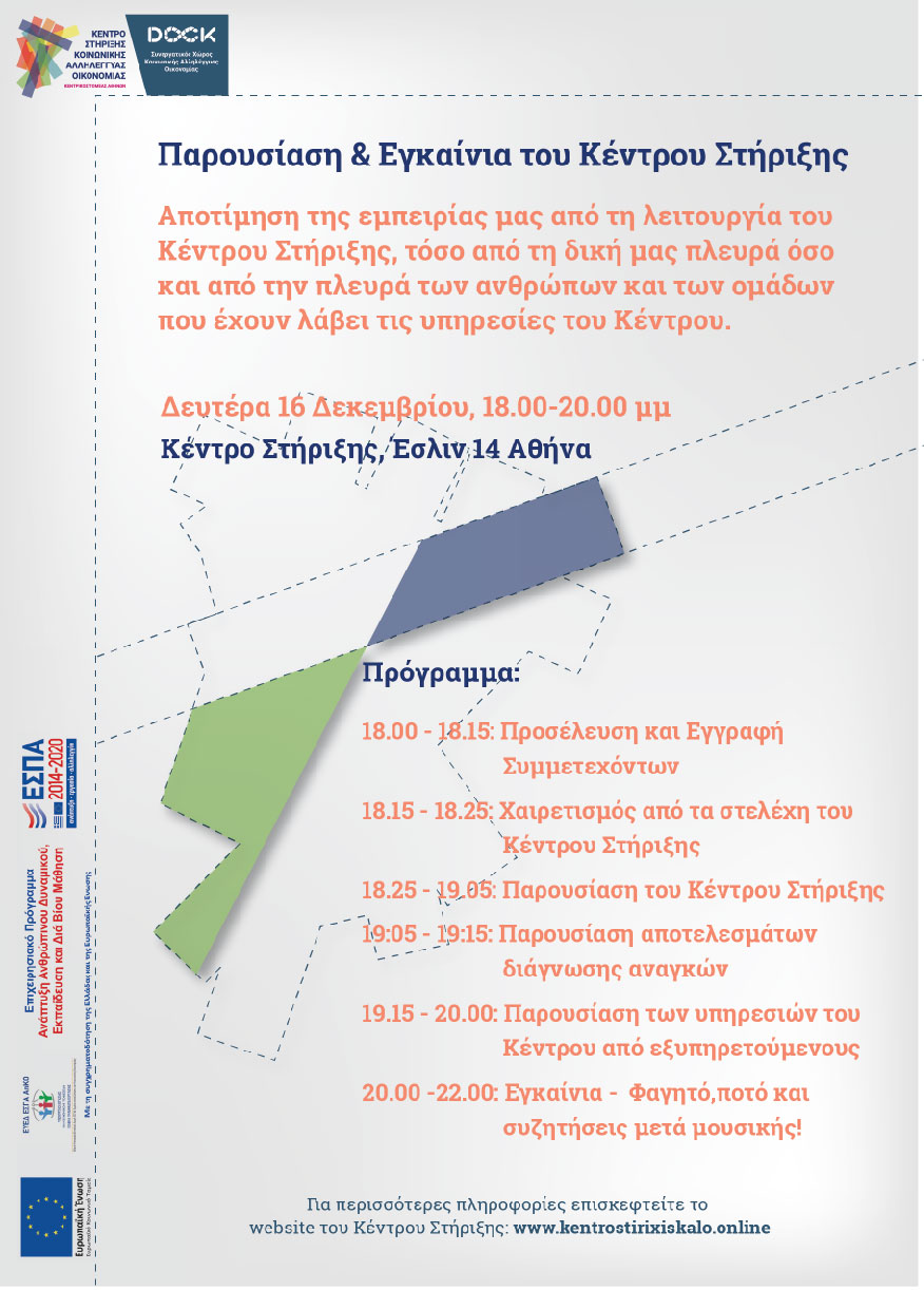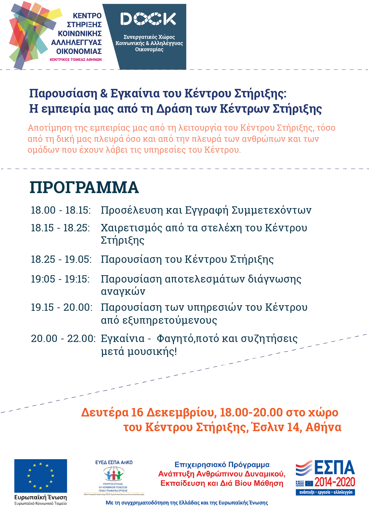 Λίγο πριν το κλείσιμο της χρονιάς, θα θέλαμε να σας προσκαλέσουμε στην εκδήλωση- παρουσίαση που διοργανώνουμε με θέμα “Η εμπειρία μας από τη Δράση των Κέντρων Στήριξης”, που θα πραγματοποιηθεί στις 16 Δεκεμβρίου, 18.00-20.00 στο κέντρο στήριξης Κεντρικού Τομέα Αθηνών, Έσλιν 14 στους Αμπελόκηπους (200μ από το Σταθμό Μετρό Αμπελόκηποι, Γραμμή 3).