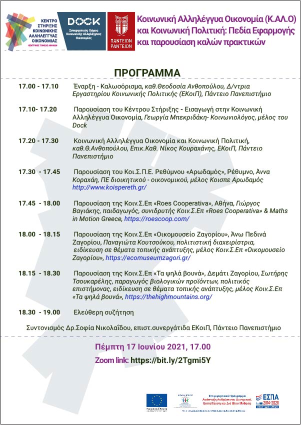 17.20 – 17.30 Κοινωνική Αλληλέγγυα Οικονομία και Κοινωνική Πολιτική, καθ.Θ.Ανθοπούλου, Επικ.Καθ. Νίκος Κουραχάνης, ΕΚοιΠ, Πάντειο Πανεπιστήμιο