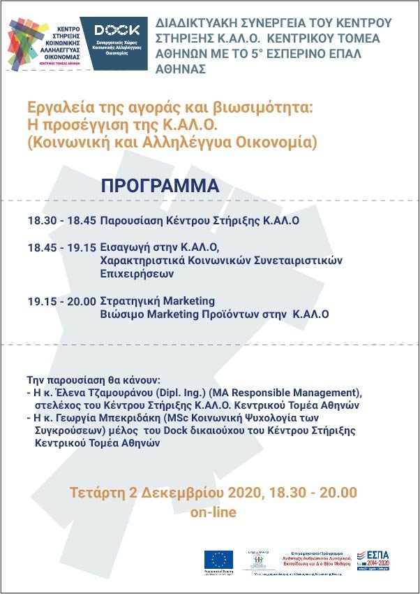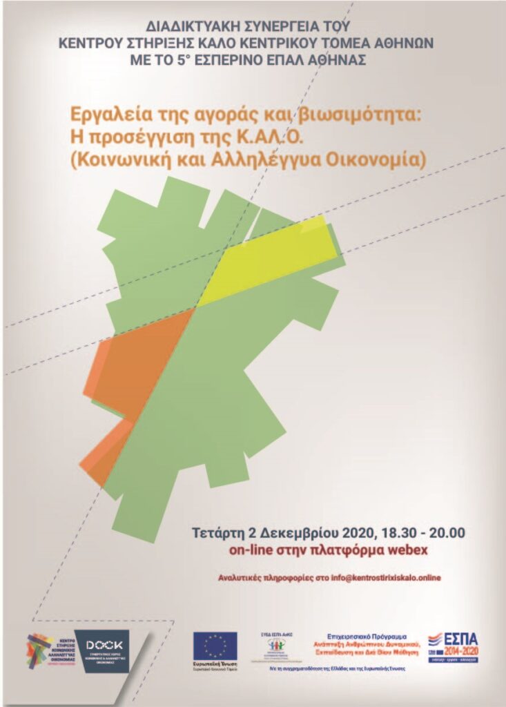 Το Κέντρο Στήριξης Κ.ΑΛ.Ο Κεντρικού Τομέα Αθηνών και το 5ο Εσπερινό ΕΠΑΛ Αθήνας συνεργάζονται με σκοπό την ενημέρωση και την επαφή των μαθητριών και μαθητών του σχολείου με μεθοδολογίες και εργαλεία της αγοράς (διοίκηση, management, marketing) με τις διαστάσεις της Κοινωνικής και Αλληλέγγυας Οικονομίας λαμβάνοντας υπόψη θέματα βιωσιμότητας ως προς οικονομία, την κοινωνία και το περιβάλλον.