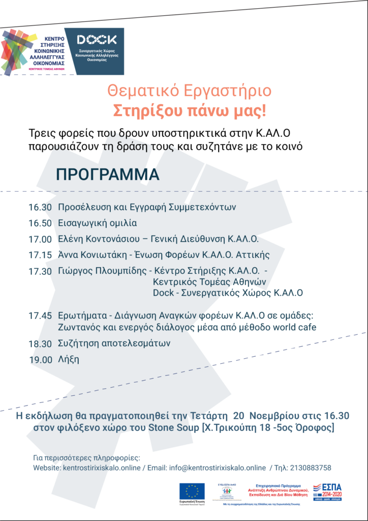 Το Dock – Συνεργατικός Χώρος Κ.ΑΛ.Ο, στους λίγους μήνες λειτουργίας του ως Κέντρο Στήριξης του Κεντρικού Τομέα σας προσκαλεί στην εκδήλωση “Στηρίξου πάνω μας”, για να απαντήσουμε μέσα από τη συζήτηση τα ερωτήματα αυτά.