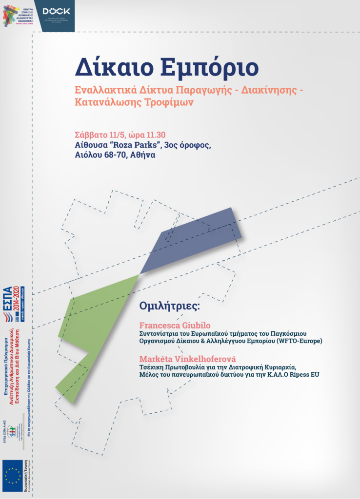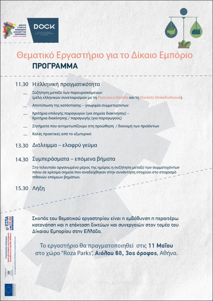 Το Dock, στα πλαίσια υλοποίησης του προγράμματος “ΕΠΙΧΕΙΡΗΣΙΑΚΟ ΠΡΟΓΡΑΜΜΑ: 3 – Ανάπτυξη Ανθρώπινου Δυναμικού, Εκπαίδευση και Δια Βίου Μάθηση (Κέντρα Στήριξης της Κοινωνικής και Αλληλέγγυας Οικονομίας), διοργανώνει σε συνεργασία με τον Συνεταιρισμό Αλληλέγγυας Οικονομίας* θεματικό εργαστήριο για το Δίκαιο Εμπόριο:
