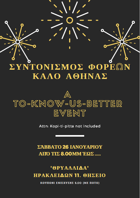 Το Σάββατο 26.1.2019, ο Συντονισμός Φορέων Κ.ΑΛ.Ο Αττικής, πραγματοποιεί στη Θρυαλλίδα ( Hρακλειδών 11, Θησείο) το πρώτο to know us better πάρτυ του.