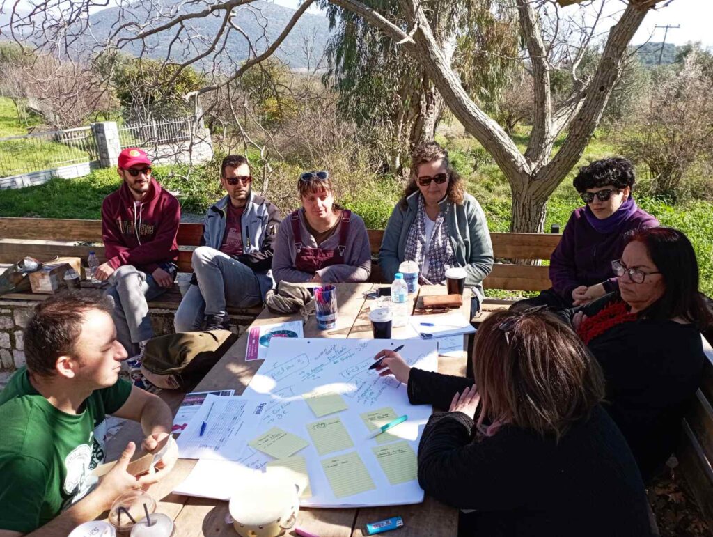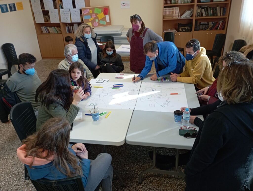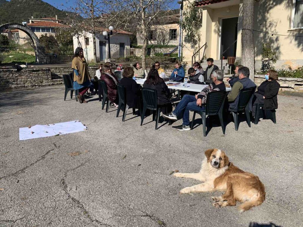 Ξεκινώντας το έργο Διάλογος & Δράση για το Μέλλον τον Οκτώβριο του 2021, και λόγω των κανονισμών για τον Covid, η πρώτη δημόσια εκδήλωση πραγματοποιήθηκε διαδικτυακά, ενώ δια ζώσης εκδηλώσεις έπρεπε να αναβληθούν. Ωστόσο, προκειμένου να συμπεριληφθεί στις διαδικασίες η παλαιότερη γενιά που δεν έχει πρόσβαση σε ψηφιακά μέσα, οργανώνονταν μικρές συναντήσεις στο προαύλιο του σχολείου σε μηνιαία βάση. Έτσι, δινόταν η ευκαιρία στους ανθρώπους του χωριού να δουν, να πλησιάσουν και να συμμετέχουν για όσο διάστημα ένιωθε άνετα ο καθένας τους και η καθεμιά τους. Αυτές οι μικρότερες συναντήσεις επηρέασαν πολύ θετικά τη συνολική ποιότητα του έργου, καθώς αφιερώθηκε χρόνος για γνωριμία, διασύνδεση και συνεργασία μεταξύ των εμπλεκόμενων ανθρώπων.