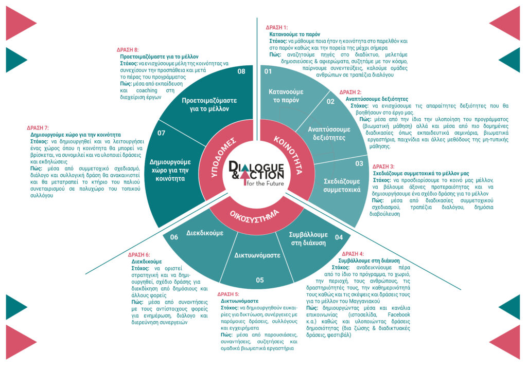 Το πρόγραμμα «Διάλογος & Δράση για το Μέλλον» είναι μια πρωτοβουλία διαλόγου και δράσης που ξεκίνησε τον Οκτώβριο του 2021, ώστε η κοινότητα του Μαγγανιακού Μεσσηνίας να προσδιορίσει το μέλλον της μέσα από διαδικασίες συμμετοχικού σχεδιασμού, διαλόγου και συλλογικές δράσεις. Επιδιώκουμε να αναδείξουμε το πλούσιο παρελθόν του μικρού αυτού τόπου, να συζητήσουμε για το σήμερα αλλά και αναζητούμε τρόπους για το πώς μπορεί η μικρή αυτή κοινότητα να αναγεννηθεί.